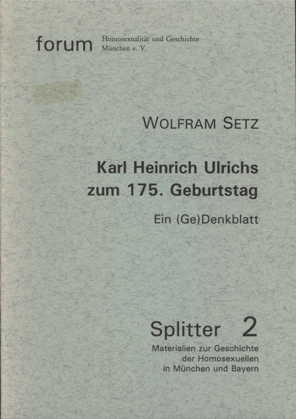 Sonderausgabe aus: Karl Heinrich Ulrichs zu Ehren. Materialien zu Leben und Werk Herausgegeben von Wolfram Setz, Verlag rosa Winkel, Berlin 2000